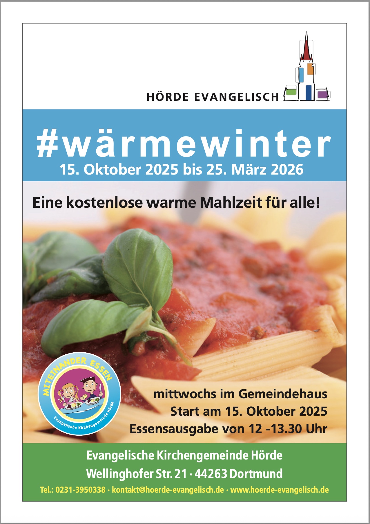 Wir bieten ab dem 15. Oktober 2025 das kostenlose Mittagessen wieder jeden Mittwoch in der Zeit von 12 – 13.30 Uhr im Gemeindehaus, Wellinghofer Str. 21 an.